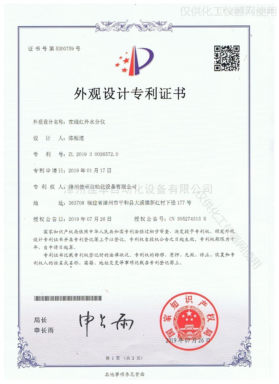 日前,公司一项外观获得*局授权,此项专L名称为“在线红外水分仪”,专L号为(ZL 2019 3 0026572.0)。